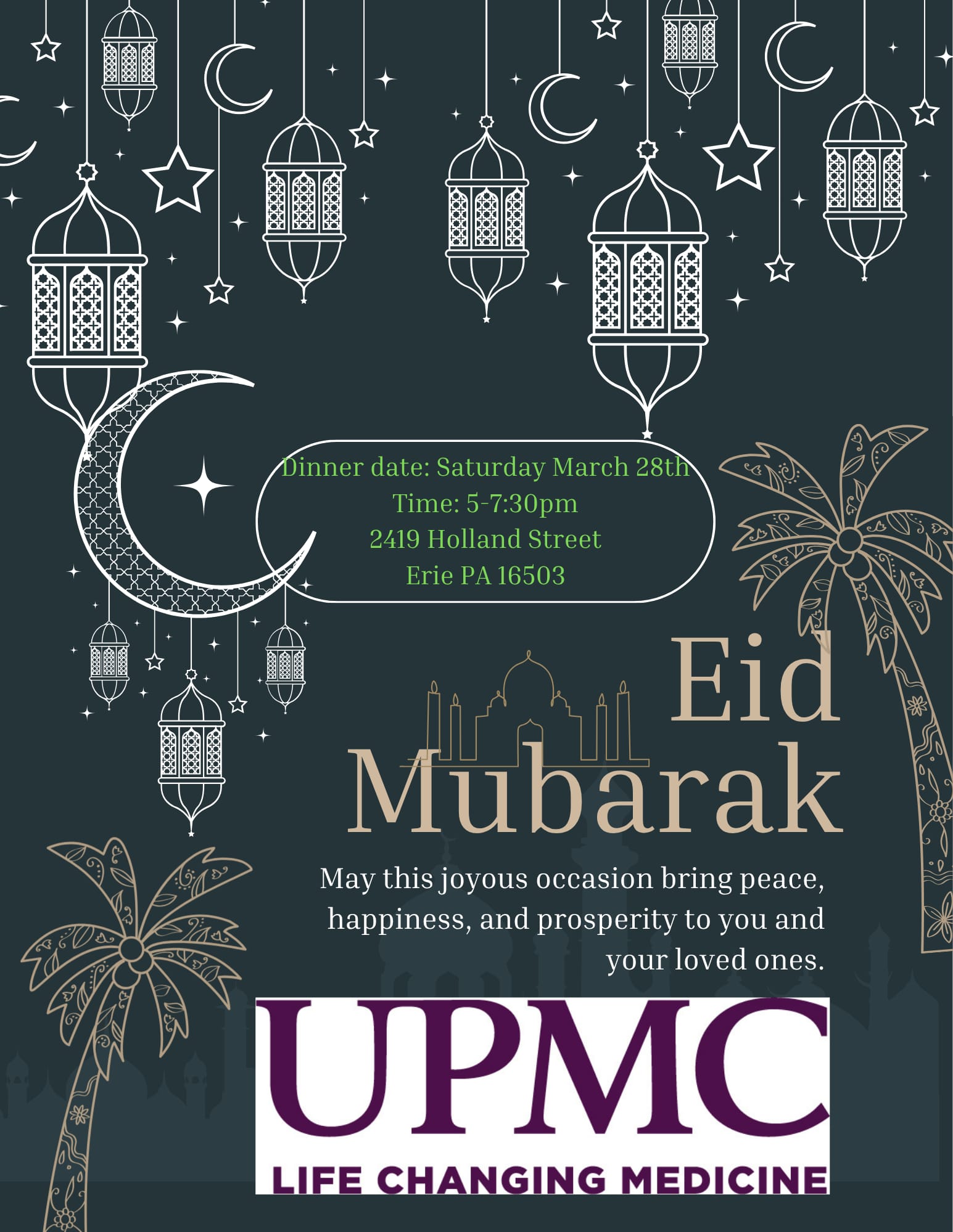Community Eid-al-Fitr dinner at IAE Masjid on Saturday, 28th March after Asar (5 pm - 7:30 pm) sponsored by UPMC.